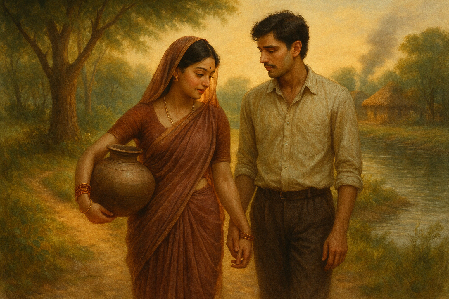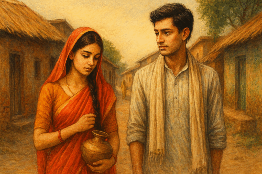 गाँव की गलियों की पृष्ठभूमि में यह चित्र एक भोले-भाले प्रेम की झलक दिखाता है, जहाँ नज़रें झुकी हैं मगर दिलों में एहसास उमड़ रहे हैं।
