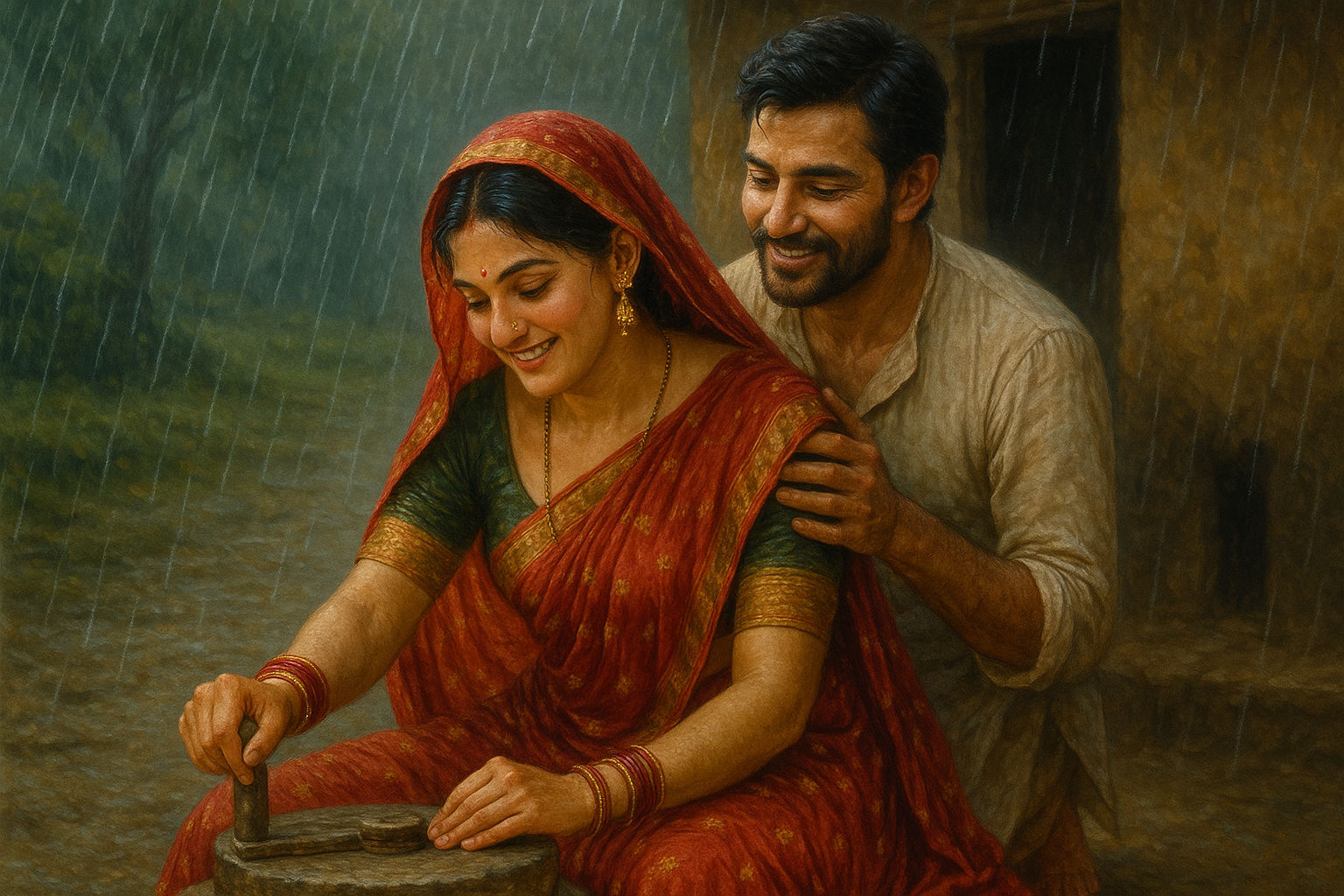 सुबह का आँगन, कुएँ पर जाती गीता की चूड़ियों की खनक ,संध्या के दीपक की रोशनी और बारिश में भीगे पल ये सब उनके प्रेम की बुनियाद हैं। Click